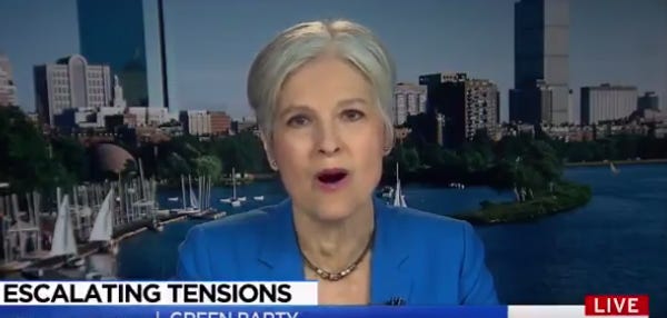 Based on all this, obviously we need to hear Stein's very important opinion on the matters of the day. Did you see how North Korea tested that missile? Did you see how Congress shoved some Russian sanctions up Dear Leader Trump's ass? Jill Stein knows what is up with these things.