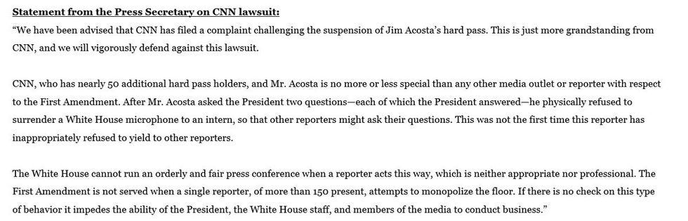 CNN is suing Donald Trump, Sarah Huckabee Sanders, and others in an attempt to get Jim Acosta's press credentials restored. CNN attorneys argue that whatever lame excuse the White House fabricated about his beating an intern to death with a microphone, the real reason Trump suspended his White House pass was plain old not liking CNN's coverage, and that there is an unconstitutional violation of the First Amendment.
