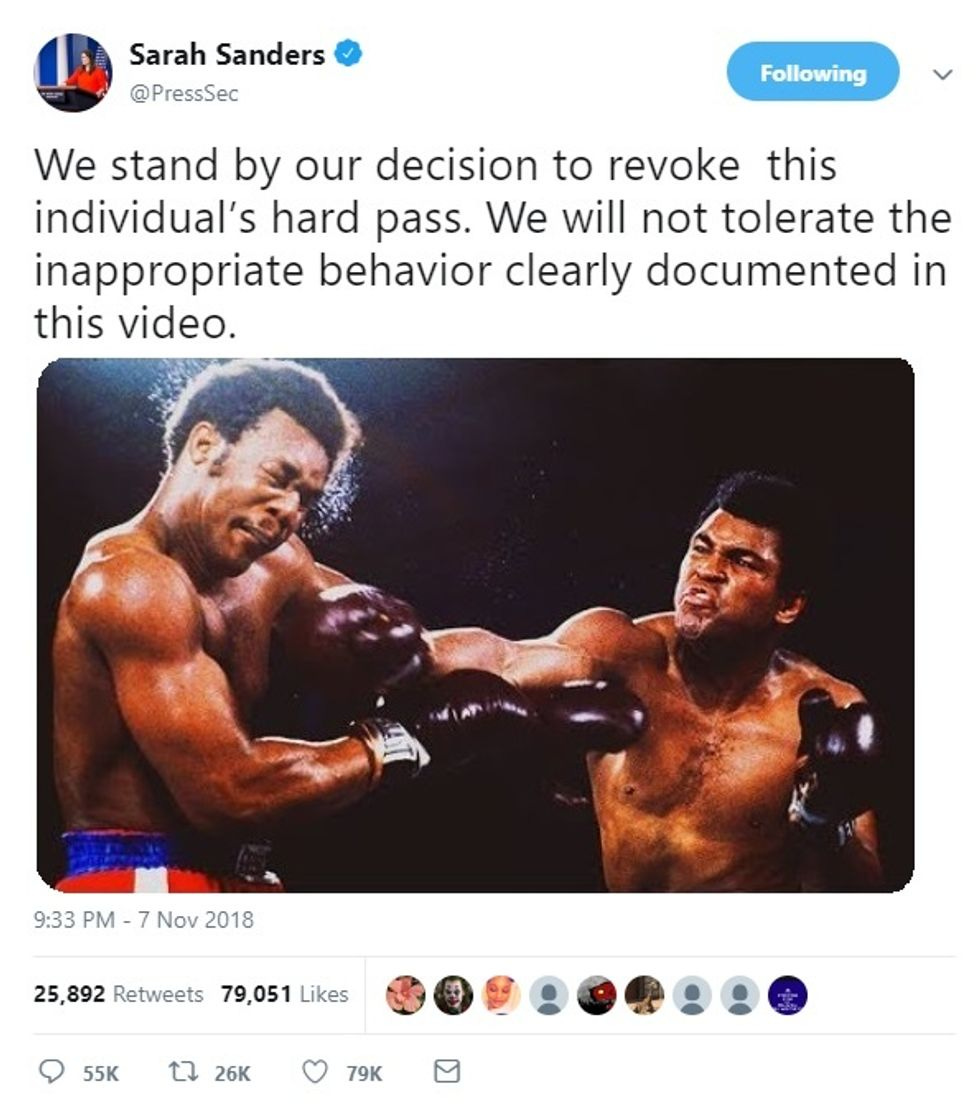 The suit argues that under the landmark 1977 Sherrill v. Knight case, the government cannot deny a reporter access to the White House "arbitrarily or for less than compelling reasons," and that last Thursday's banishment of Acosta was therefore illegal. CNN notes that Acosta was never notified of his pass being revoked, and that he only learned of it when he showed up to work at the White House Thursday night. Sarah Sanders's announced reason for pulling Acosta's credentials, the claim he'd "place[d] hands upon" an intern who was trying to grab his microphone away, was fabricated, the complaint says, and is refuted both by other witnesses in the press room, and by the ludicrously manipulated video Sanders tweeted to "prove" Acosta had accosted the poor lass. We mean, get real.
