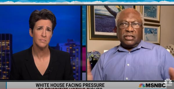 In Clyburn's Politico interview, he said clearly that if both the For the People Act and the John Lewis Voting Rights Act don't go to President Biden's desk, "Democrats can kiss the majority goodbye." Not only because Republicans are working at warp speed to outlaw voting every place they can, but also, because he said he "can see in a state like Georgia — where people stepped up in January in a way nobody thought they ever would — I can see the disappointment in the voters to the extent that [Senator Raphael] Warnock would not be back."