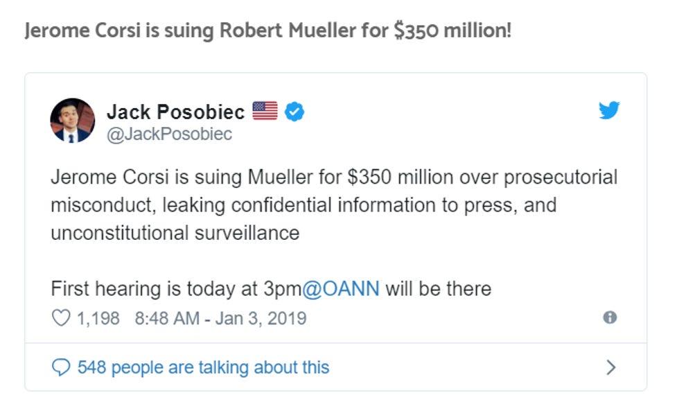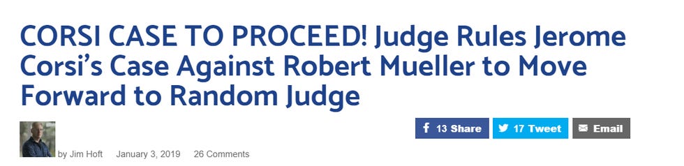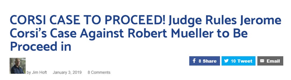 HOORAY! Dipshit McBirther Jerome Corsi's case against Robert Mueller, where he is suing him for $350 million American dollars, will go forward! It will be taken seriously by grown-ups and nobody will laugh at it ever again the way Wonkette did!