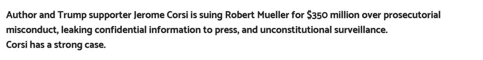 If you don't remember, Corsi's lawyer in his pursuit to expose Mueller's prosecutorial misconduct is Larry Klayman, who is basically the Hair Club president and also a client of losing lawsuits or having them thrown out entirely or having courts refuse to even waste their time dignifying them with a response. This is why we call him a "superlawyer."