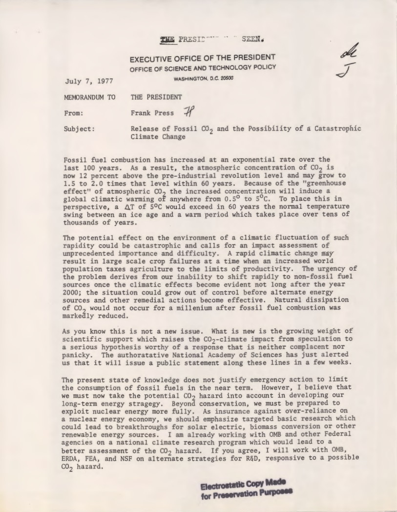 A few months after that speech, Carter received a July 1977 briefing memo from his chief science and technology adviser Frank Press about the danger fossil fuels posed for warming the planet. It’s a remarkably prescient document, laying out the basics of the science at the time — and already using the term “Climate Change,” although prefaced by the warning that it could be “Catastrophic.” (Note also the partial stamp at the top saying “THE PRESIDENT HAS SEEN.”)