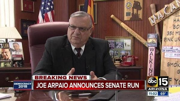 Arpaio reconstructed for the small crowd that glorious time when he introduced Donald Trump at a Phoenix rally in 2015, pointing out that he and the Great Man shared three things: the same birthday, the same (lawless) dedication to cracking down on Messicans (though Arpaio said "illegal immigration" because he has to be all statesmanlike and shit), and -- of course -- a deep and abiding belief that Barack Obama is a foreigner from Muslimland. And like Trump, Arpaio plays at not naming exactly what he means, at least for a few seconds, since some people might miss it:
