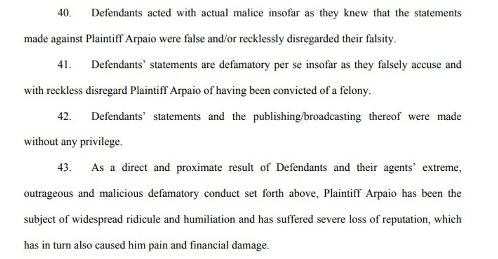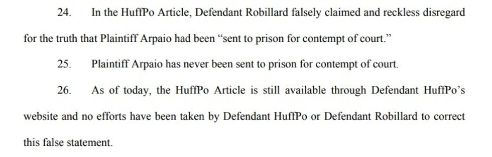 Oh, hey, speaking of errors and corrections, the lawsuit is factually wrong about the HuffPo article by Kevin Robillard, which wasn't merely corrected to say he'd been convicted of a misdemeanor, but also included a note stating the previous version "mistakenly indicated Joe Arpaio went to prison for his conviction." How do we know about that? From the slapdash appendix to the filing, which includes copies of both the original and updated text. You wouldn't know that from the complaint itself, though, because Larry Klayman is A IDIOT who has difficulty writing a simple declarative sentence, as we see in the first line here: