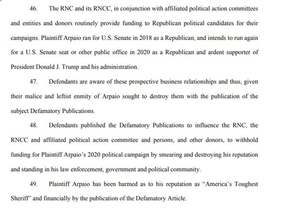 Still, these are Very! Serious! Defamations! according to the lawsuit. Just look at the malice and leftist enmity aimed at forever destroying Joe Arpaio's dreams of becoming a US senator!