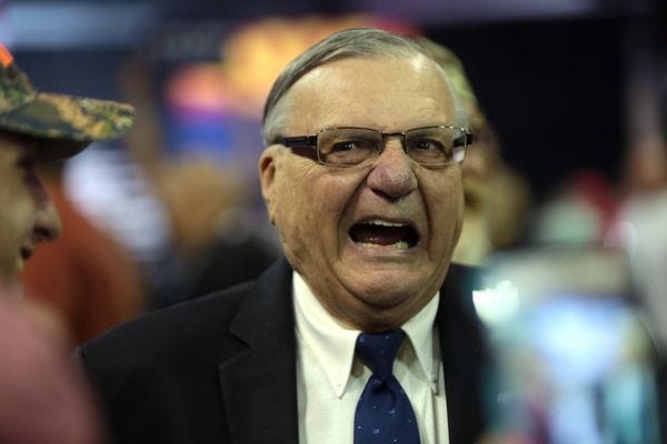 WHY IS JOE ARPAIO STILL HERE? After the people of Maricopa County finally kicked his flabby ass to the curb, after he won a whopping 18 percent in the GOP primary for Jeff Flake's seat, after all the horrible shit he did and still managed to grift himself a pardon, why has he not vanished in a puff of acrid, sulfurous smoke?
