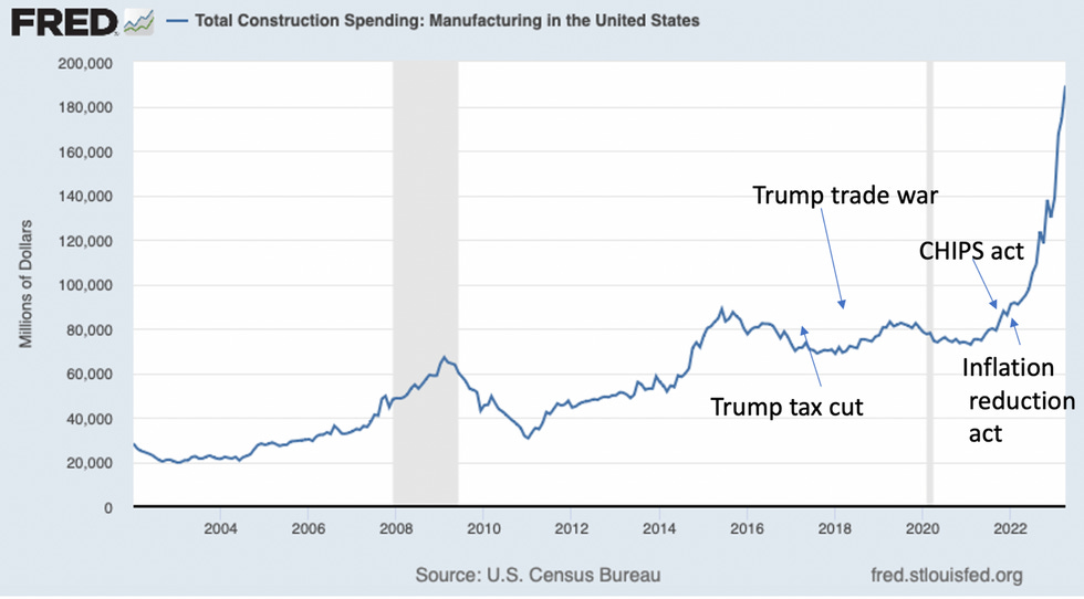 Meanwhile, manufacturing in the country is actually starting to exist again — Paul Krugman describes the growth in manufacturing investment as "parabolic," which you can see here:
