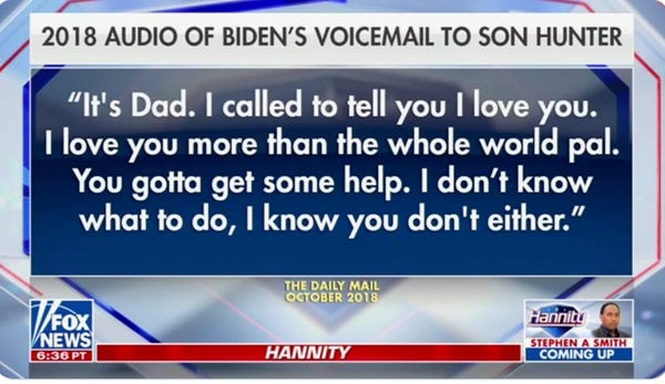 Monday night, Fox News propagandist Sean Hannity played a voicemail Joe Biden left for Hunter back in 2018, when neither man was president. The audio was "obtained" by the Daily Mail . In the voicemail, an obviously despondent Biden says, "It's Dad. I called to tell you I love you. I love you more than the whole world, pal. You gotta get some help. I know you don't know what to do. I don't either."