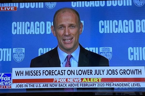 Fox news went with a chyron that, in small print, acknowledged there were 629,000 more jobs in July than the month before the pandemic, but screaming that the White House had missed the forecast. Spinning "twice as good as expected" as a fuckup is a hell of a trick!