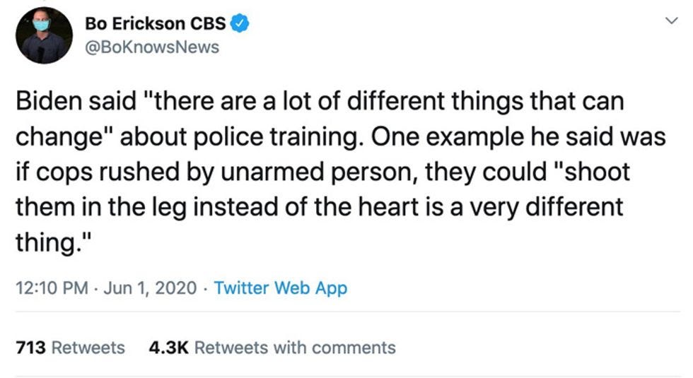 Just to make matters worse, because they can always be made worse, Mediaite notes that in an early tweet about the speech, CBS reporter Bo Erickson didn't describe Biden's comments clearly — not that an unarmed person with a knife is all that clear to start with, but Erickson left the knife out altogether, suggesting that Biden had called for shooting unarmed people: