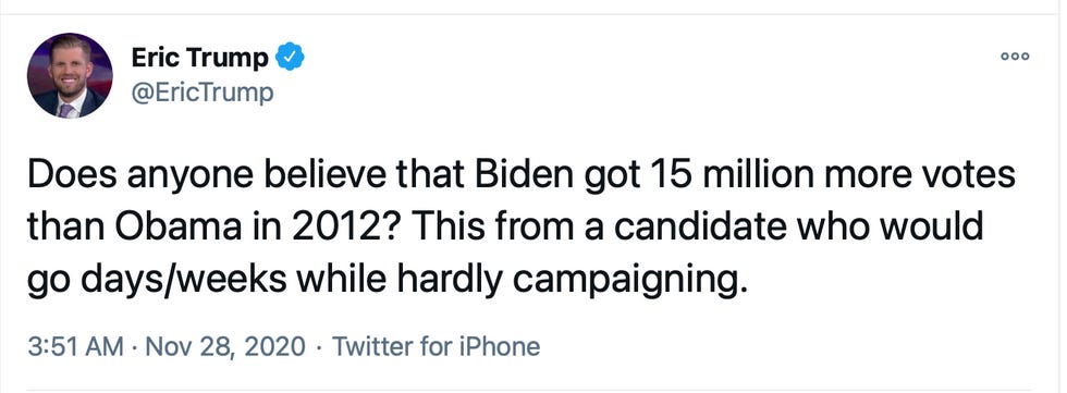Trump's spare idiot son, Eric, questioned why anyone would believe the evidence that's clear in front of their non-Trump-shaped faces.