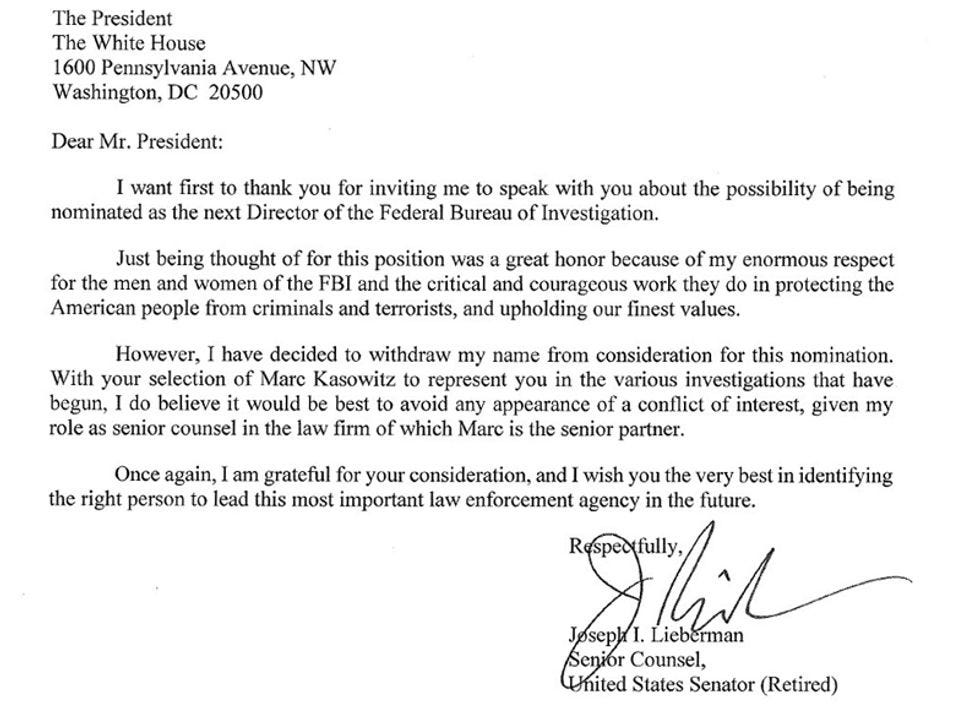 In your "another bullet dodged for now" news for today, former Senator Joe Lieberman has officially withdrawn his name from consideration for the job of FBI director, since Marc Kasowitz, a partner in his law firm, has been named to lead Donald Trump's defense in the nonexistent Trump-Russia case that isn't real but would nonetheless be a possible conflict of interest, possibly the first to be recognized by anyone considered for the Trump administration. In a letter announcing his withdrawal, Lieberman thanked Trump for the "great honor" of considering him, but said it was best to avoid any appearance of conflict: