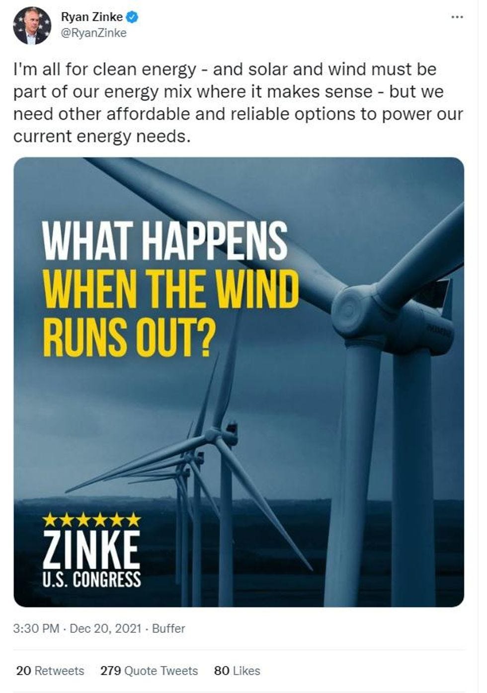 Speaking of which, there's also this stupid thing from Donald Trump's former Interior Secretary Ryan Zinke, who worries that we'll "run out of wind," and no, that's not a science thing either.