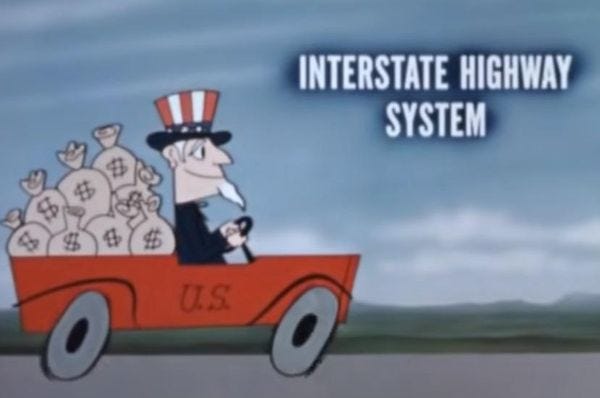 It's a ridiculous fantasy to claim America's automotive infrastructure burst forth in free market glory (possibly from the forehead of Milton Friedman), as anyone who's spent five minutes reading about the Interstate Highway System knows. The federal government literally built that, pouring billions into the planning, routing, and construction of the interstates, which reshaped American cities, exacerbated racial inequality, made suburbs possible, and radically changed everything about American business, manufacturing, and leisure.