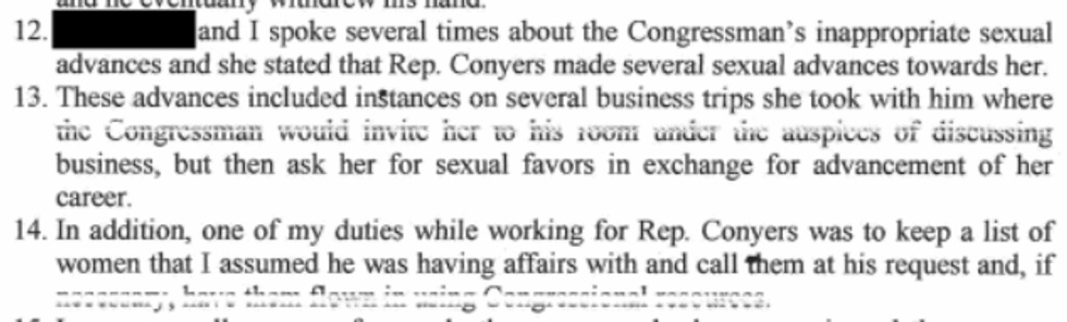 Another affidavit of support describes Conyers being asked to "pick up women and bring them to Mr. Conyers," and the congressman's habit of rubbing female staffers' legs in a sexual way. Yet another affidavit features much more of the same.
