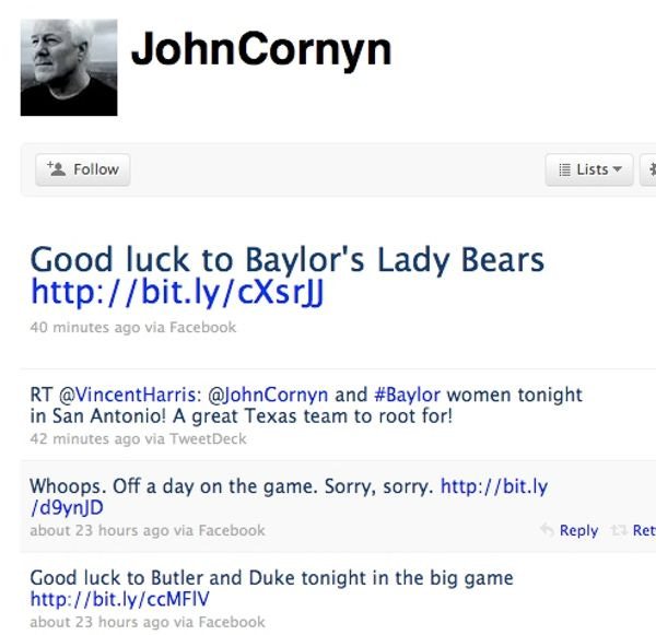 Two minutes later, he posts his "Good Luck athletic team that is apparently good at sports," and again, he is one day late, as the Baylor ladies lost badly to Connecticut last night. The team members had presumably been depressed all day and were likely together, each with her laptop, refreshing Cornyn's Twitter account for hours on end, hoping to get a lil' pick-me-up from their beloved Senator Big John. What a terrible shock this must have been to them. If they haven't all committed suicide yet, it's only a matter of time.