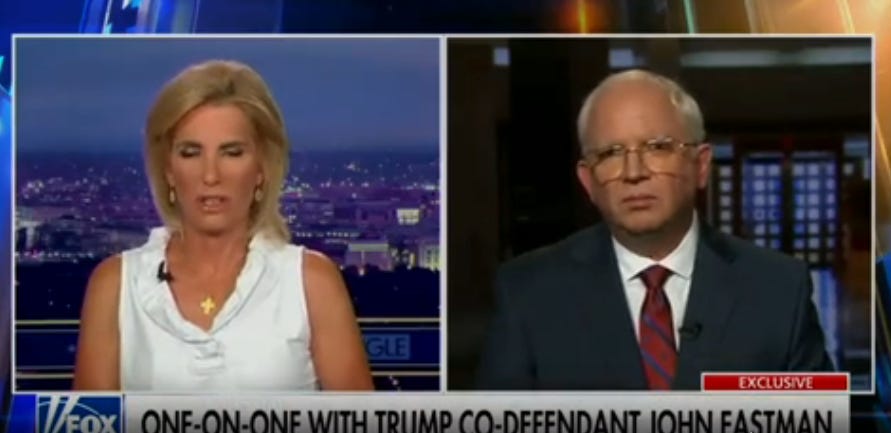 Eastman had an important legal interview last night on Fox News with Laura Ingraham, where he issued a hilariously deranged challenge.