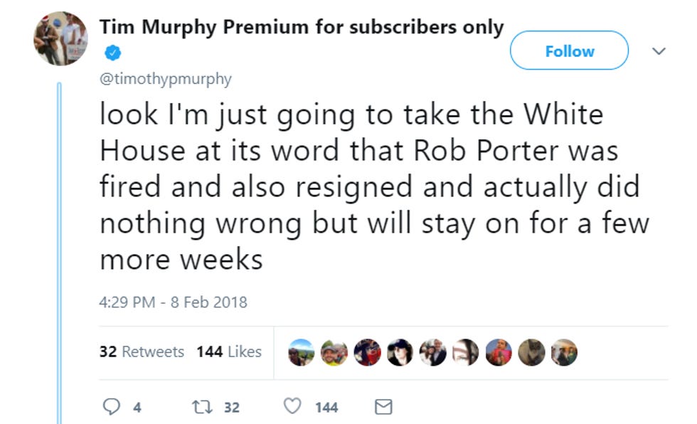 The latest news is that John Kelly knew about the allegations against Porter for-e-ver (since last fall!), and apparently so did White House counsel Don McGahn (found out a year ago!). This is totally normal because, on top of how these jokers wanted to keep a wife-beater on staff, this means Rob Porter has been working this whole time without a real grown-up security clearance, because he couldn't get one due to what his ex-wives had told the FBI about him. To be clear, the White House staff secretary sees everything the president sees, so this is not normal, but then again, nothing in this White House is normal and if Jared still can't get a full security clearance, who needs one?