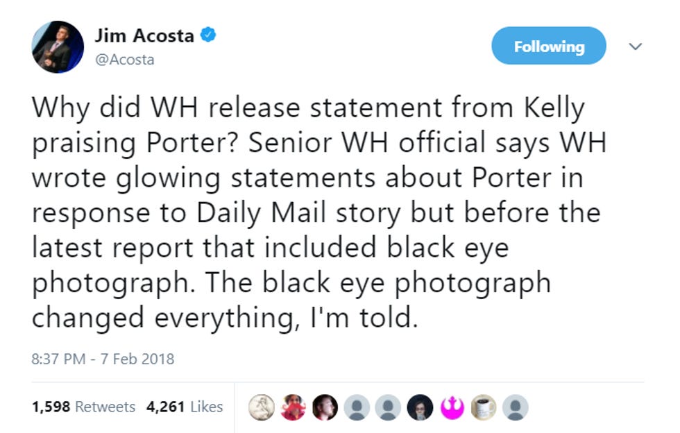 Intrepid journalists continue to deliver the goods about the great saga of the White House accepting the resignation of high-level staffer and Hope Hicks boyfriend Rob Porter after news of his constant wife-beating went public.