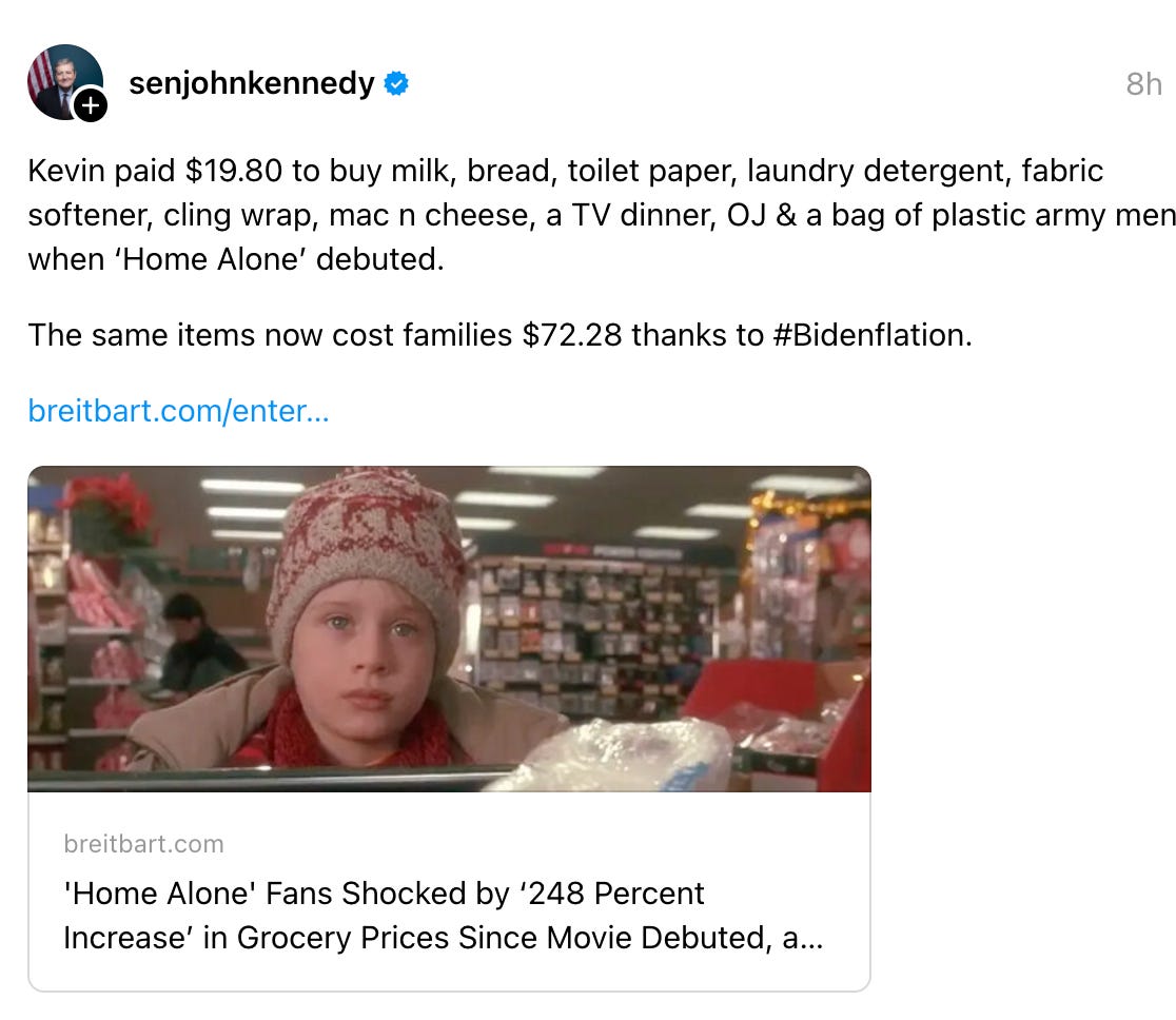 Republican Sen. John Kennedy from Louisiana claimed these items would cost $72.28 (thanks to #Bidenflation), but I’m more inclined to trust the nice lady on Tik Tok. Anyway, this might blow your mind, but it’s been 33 years since 1990, when Color Me Badd was blowing up the charts. Chicago’s minimum wage at the time was just $3.80. It’s now $15.80. Chicago’s median household income in 1990 was around $32,252. It’s now about $70,000. None of these figures explain how Kevin’s parents afforded that straight-up mansion where they lived, but there’s nothing to indicate that Joe Biden’s economic policies have “crushed family holiday budgets.”