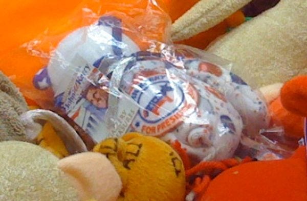Gawker commenter "likebitchisabadthing" sends us this alarming photo from one of them grabber-claw machines at a Friendly's restaurant. See that weird cellophane-wrapped mummy in the middle, the one that says "John Kerry for President"? What is up with that, man?Is Kerry already planning a coup?See the close-up after the jump.