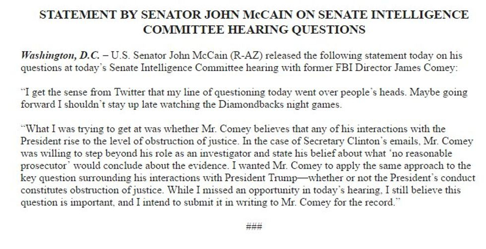 For what it's worth, McCain has released a statement saying his questions obviously went over everyone's heads, and also he shouldn't stay up past bedtime watching action-packed baseball.