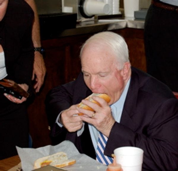 Apparently McCain met for lunch with some women at a Philadelphia diner, and then he went up to a podium to give a speech, whereupon people started chanting "Obama." And so nobody could hear him, so his supporters helpfully began chanting "JAMMAKAIN," and then really literally nobody could hear him. So he just gave up.