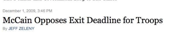 The most shocking news story of the day, no? Walnuts says, "The way that you win wars is to break the enemy’s will, not to announce dates that you are leaving." VICTORY! This article also notes, terrifyingly, that Walnuts -- who's never seen a war worth ending -- "will be the leading Republican voice on the president’s strategy for Afghanistan and Pakistan." There we go, then! The leading opposition party voice in this effort is still using terminology like "win wars" to describe the goals in Afghanistan! He should be a very flexible negotiator during the next 20 years of this war. [ NYT ]