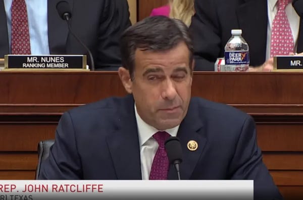 Trump has been enamored of Ratcliffe for a while now. He thought it was just really impressive all those moons ago when Ratcliffe questioned Robert Mueller, as he cleverly shouted that nobody should be "above the law," but accused Mueller of putting Trump "below the law," whatever the hell that meant. Ratcliffe accused Mueller of violating every rule in the book (which book? don't know), and he just seemed generally mad that Mueller had even written a report about his beloved president. Around the same time, Ratcliffe went on Fox News and said Mueller's report was actually written by "Hillary Clinton's de facto legal team."