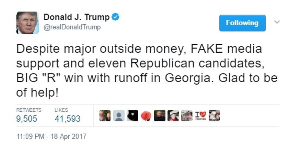In Trumpian math, a 28.6 point win over the closest Republican is actually a loss. Or maybe Trump simply assumes Handel will now automatically win in June since she won't be running against any other Republicans. Not mentioned by Trump: Handel ran as an establishment-type Republican, distancing herself from Trump policies whenever possible, while the Republicans who most closely allied themselves with Trump didn't win cacadoody: