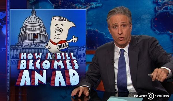 Jon Stewart is on top of all the latest hot issues in the midterms, like the Iowa debate between Senate contenders Joni Ernst and Bruce Braley, where each tried to out-folksy the other. Or the exciting process of introducing doomed legislation largely for the purpose of running on it, or slamming opponents for having voted against it: "Congress has now greatly simplified the process for passing laws, in that it does not."