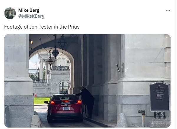 Just to prove how weird Republicans can be, RNSC comms chair Mike Berg twote a screenshot of the two paragraphs about Tester’s EV comments and the Prius bit, adding “Fun Fact: Jon Tester drives a Prius.” Surely the EV threat is every bit as dangerous as CRT and DEI and LGBTQ+! The tweet prompted people with blue checks to repeat their favorite anti-hybrid and EV lines — if it’s used, the battery is probably shot already! — although a few folks added that yes, a Prius also has a four-cylinder gasoline engine, genius.