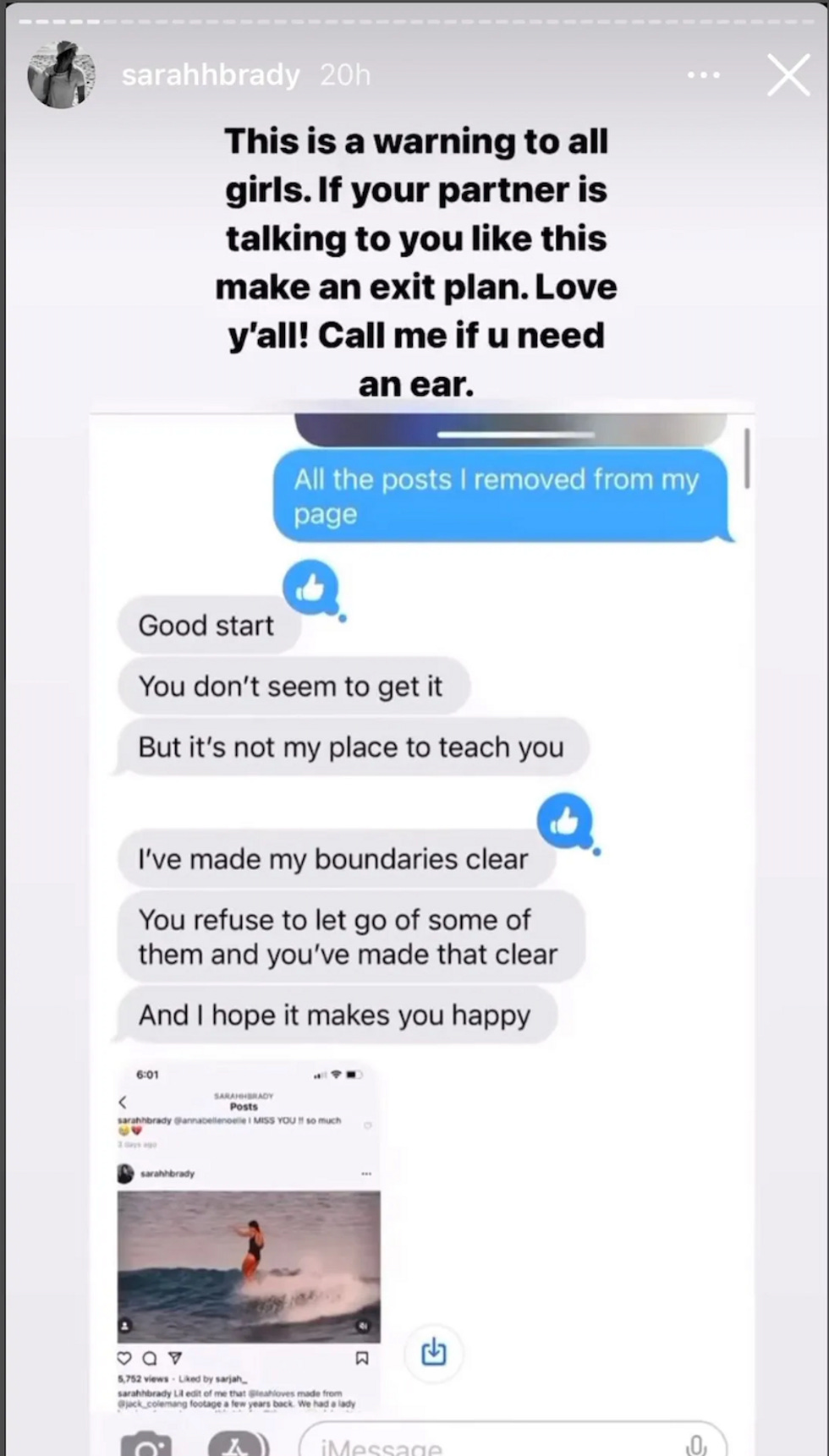 “This is a warning to all girls. If your partner is talking to you like this make an exit plan,” Brady began a series of Instagram stories posts over the weekend, accompanied by a video of a text exchange with Hill regarding his demands that she remove several Instagram posts in which she was surfing in a bathing suit and he tells her that it's still not good enough, pointing out another photo he found of her on a surfboard in a one-piece. Why? Because this was a violation of his boundaries.