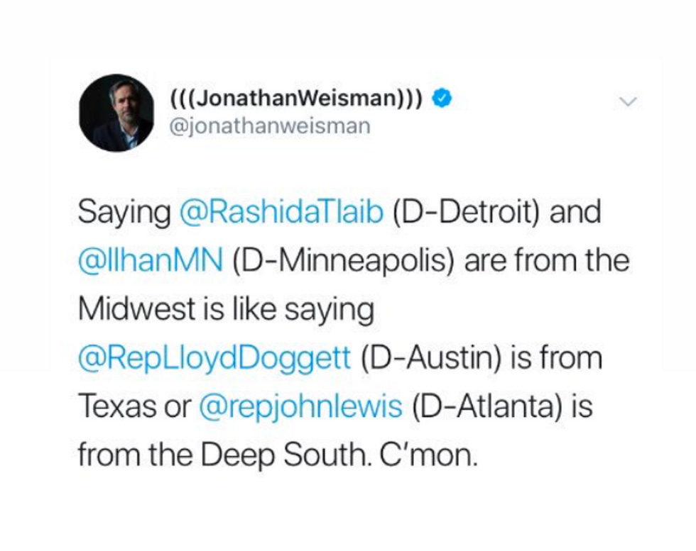 Weisman's tweet implies that Tlaib and Omar aren't "really" from the Midwest. They're brown and Muslim, and no Muslims live in the Midwest except for the more than 200,000 combined that live in Minnesota and Michigan. This is next of kin to Donald Trump's "go back where you came from" rhetoric but suitable for a fancy Manhattan book release party. We're reminded of David Bowie's interview on MTV when he confronted a douchenozzle VJ about why the network refused to air videos from black artists. His explanation came from a similar POV as Weisman's.