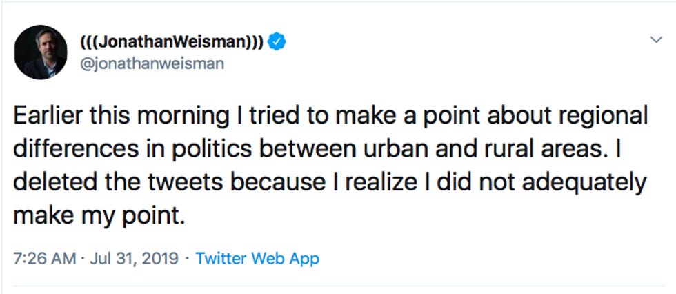 "Earlier this morning I tried to make a point series of dumb and easily disprovable lies about regional differences in politics between urban and rural areas. I deleted the tweets because I realize I did not adequately make my point shit the bed."
