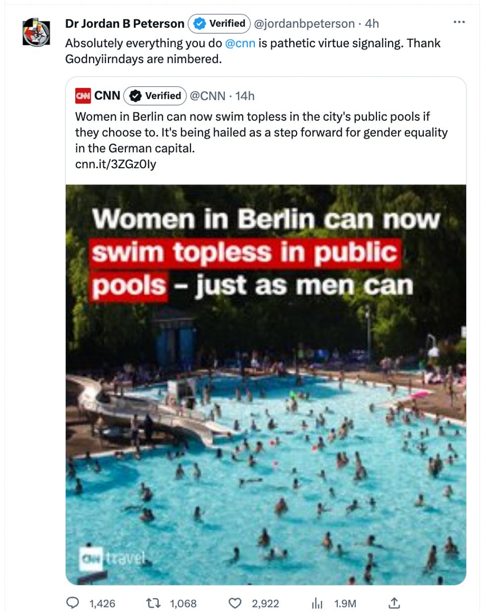 Peterson also got mad at CNN for reporting on Germany allowing women to swim topless in public pools just like men and was in fact so enraged by the "pathetic virtue signaling" that he couldn't even finish typing out a sentence normally. "Absolutely everything you do CNN is pathetic virtue signaling," he wrote, adding "ThankGodnyiirndays are nimbered," by which we assume he meant "Thank God your days are numbered."