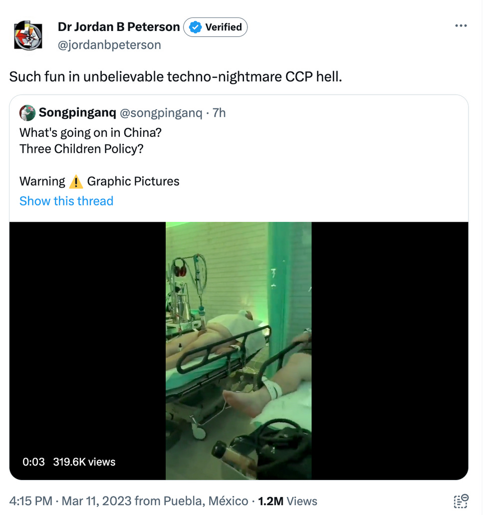 On Saturday, Peterson quote tweeted a video of a bunch of men lying in hospital beds with pumping machines attached to their penises. The person who originally tweeted it implied that this was some kind of official state-sponsored breeding program happening in China, and Peterson wrote, "Such fun in unbelievable techno-nightmare CCP hell."