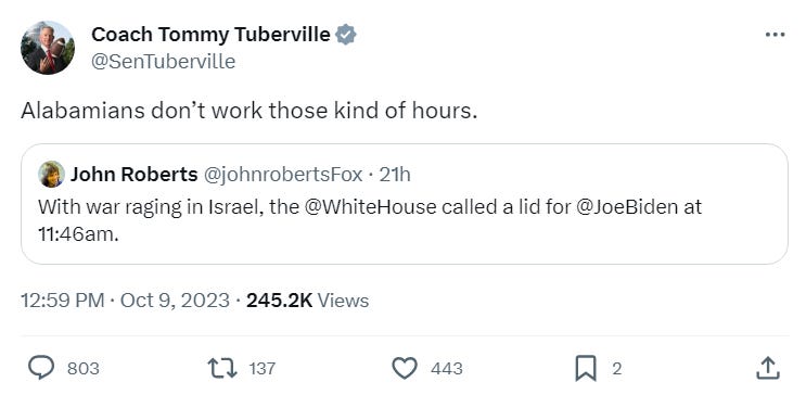 Of course, when you click on the article, you simply find Missouri Republican Senator and pissant seditionist Josh Hawley jerking off on Twitter, joined by a couple no-name paid blue check Republican grunts who don’t matter. World’s stupidest senator Tommy Tuberville, who is actively aiding and comforting our enemies with his ongoing attack on the US military, joined in the fun.