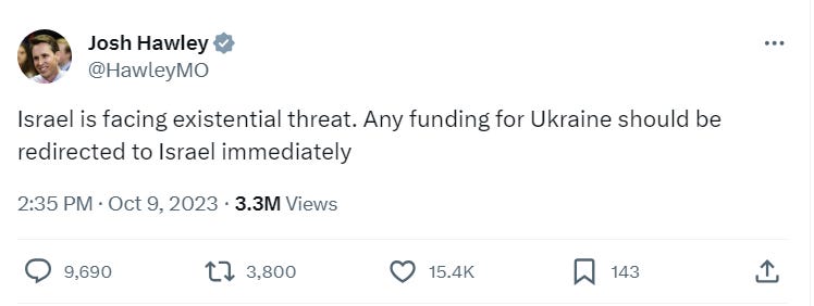 “Israel is facing existential threat,” he said. “Any funding for Ukraine should be redirected to Israel immediately.”