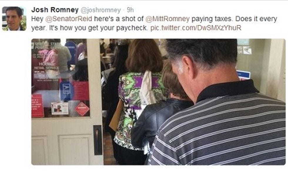 A couple of points we feel compelled to make to poor Josh Romney and his eternally wounded fee-fees. First, no one ever accused your daddy of not FILING tax returns, just of not paying any taxes. So until you tweet a picture of the check (preferably with lots of zeros on the end of it) your daddy was mailing to the United States Treasury yesterday, we’re going to continue to think he’s a rich douchebag who has hired an army of accountants to keep all his money -- and your tax-free inheritance -- away from the government this year, and damn near every other year for the last decade-plus.