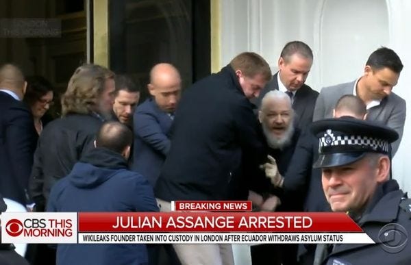 Wikileaks founder Julian Assange was arrested in London this morning after finally pissing off the Ecuadorian government -- his hosts for almost seven years in their embassy there -- one too many times. After Ecuador withdrew his asylum status, Assange was arrested by London's Metropolitan Police, who had been invited into the embassy to see the gentleman out, please, according to a statement from the coppers. The initial arrest was on a 2012 charge of skipping bail while evading arrest on Swedish rape charges (since dropped), but police confirmed Assange was also arrested a second time in connection with a warrant from the USA, and that he would face extradition.