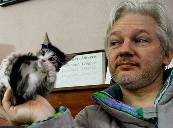 We want to say right here at the outset that we hate Julian Assange. Aside from the sexual assault allegations against him, and aside from the fact that he's just a generally stinky and loathsome person who reportedly smeared poop on the walls at the Ecuadorian embassy in London, while reportedly not taking care of his cat, an innocent creature, he acted as Russia's handmaiden during the 2016 election, in order to further Russia's campaign to steal it for Donald Trump. All signs point to his campaign being a success!