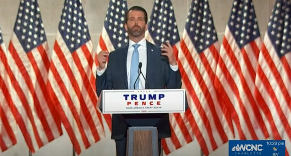 We want to focus on Donald Trump Jr., himself, because it was his big night at the convention to tell Mr. President Daddy what a good job he is doing, how his Daddy is better than yours, and maybe if Junior says nice words about Daddy REAL GOOD Daddy will remember to send him a birthday card this year maybe, probably not, allegedly.