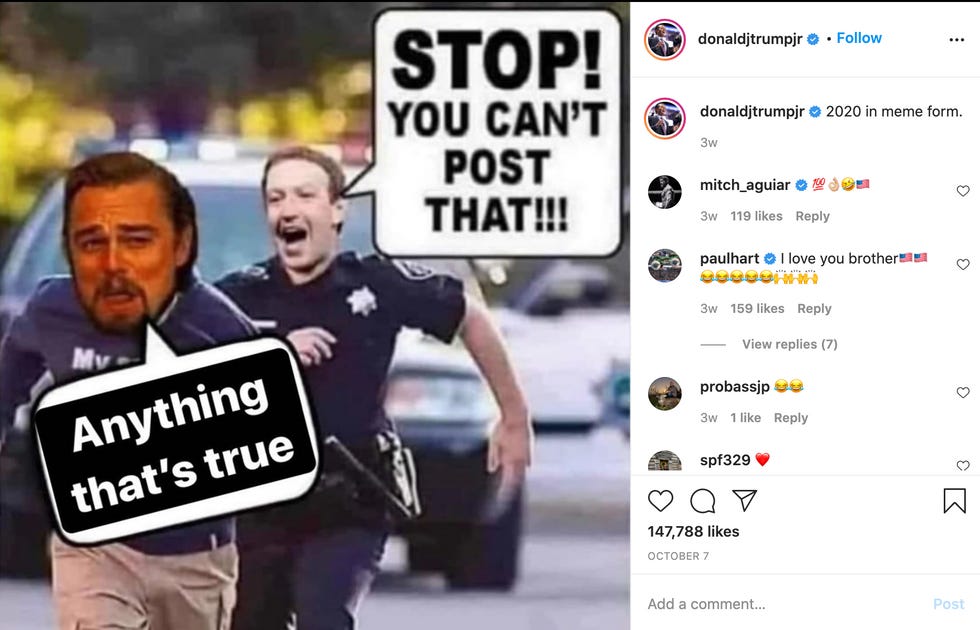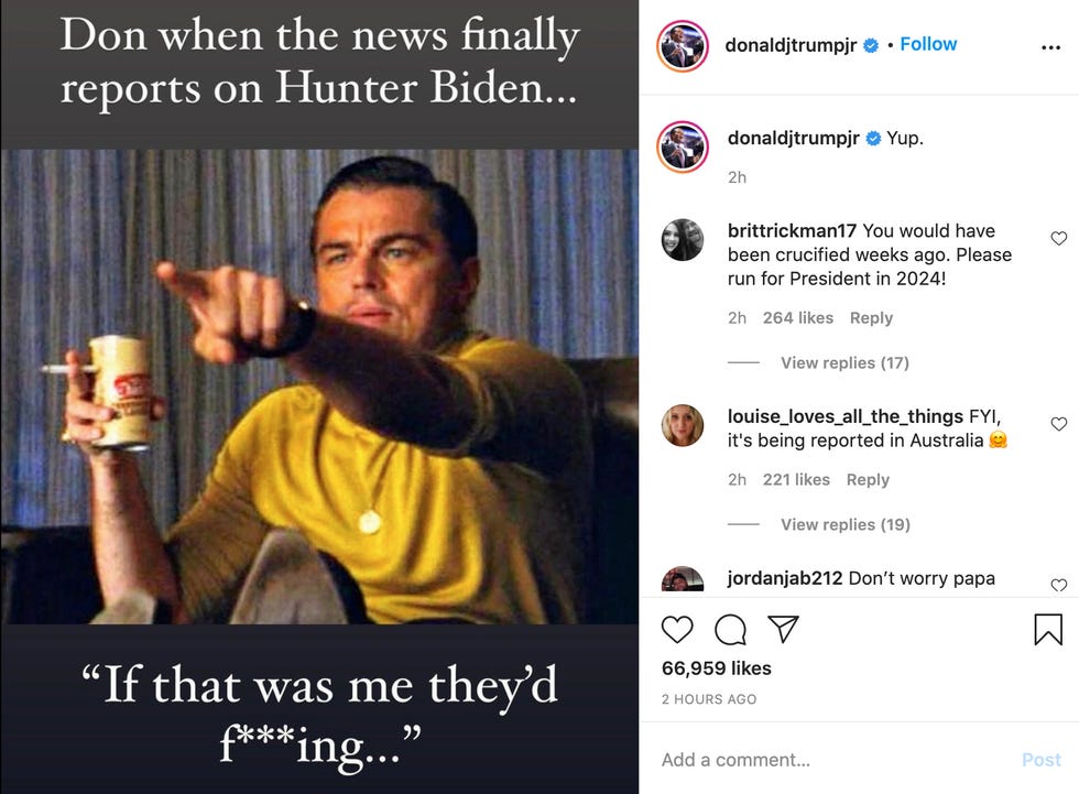 I did, actually, go over to Trump Jr.'s Instagram. Because hey! I could be wrong, and I am always open to being wrong. What I saw was an unusual number of memes in which Donald Trump Jr. is apparently supposed to be represented by Leonardo DiCaprio. What is that? The opposite of body dysmorphia?