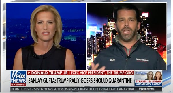 Donald Trump Jr. is very upset. Not about the deaths, not about the spike in new cases, but about the fact that people keep talking about the virus like it's some kind of big deal when it's definitely all under control now. Last night, he went on Laura Ingraham and whined about how unfair it was that, in the midst of this spike, no one will talk about how it's not even that bad anymore.