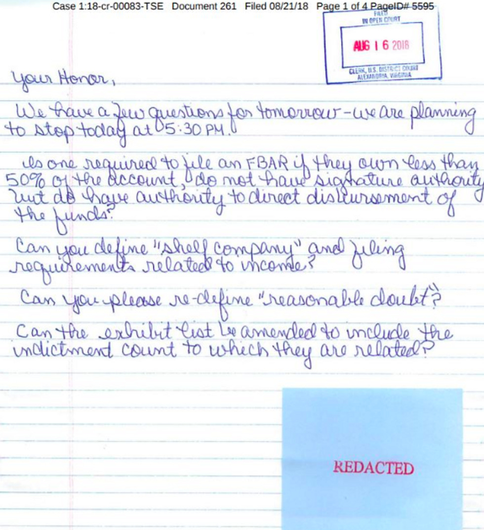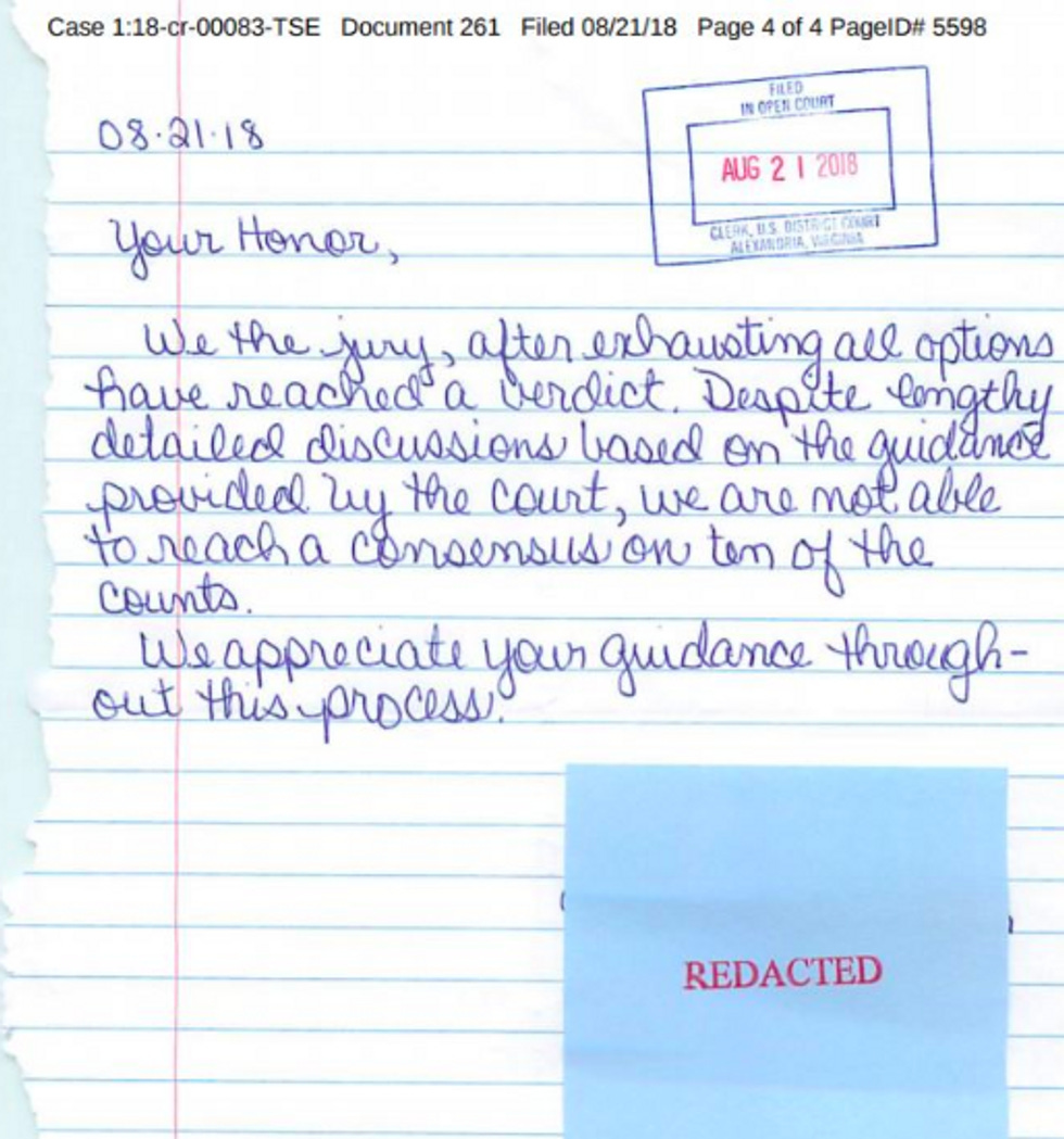 Now that they've pulled back the curtain on jury deliberations, we know that there was an issue with a juror on day 9 ( told ya so! ). CBS reports that one member of the panel had called the defense's cross examination of a witness "weak," but Judge T.S. Ellis determined there was no bias after questioning each juror individually.