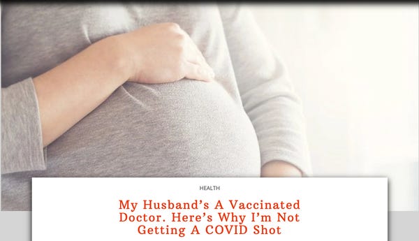 So, if you want to know why I, at nearly 30 weeks pregnant and married to a fully vaccinated doctor, am not yet vaccinated against COVID-19, suffice it to say that I have determined there is a possibility that our major health institutions might not have my unborn daughter's best interests at heart. They, after all, would neither admit that she is a human nor a girl at this point.
