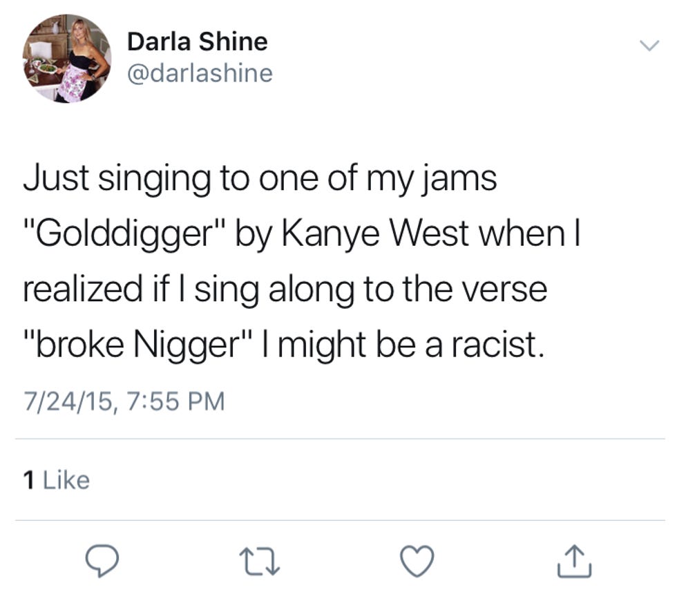 Darla is also very upset that she cannot rap along with Kanye, because if she says the n-word people will think she is a racist. Oddly enough, this clearly was not a concern of hers when posting literally everything else she ever posted on social media.