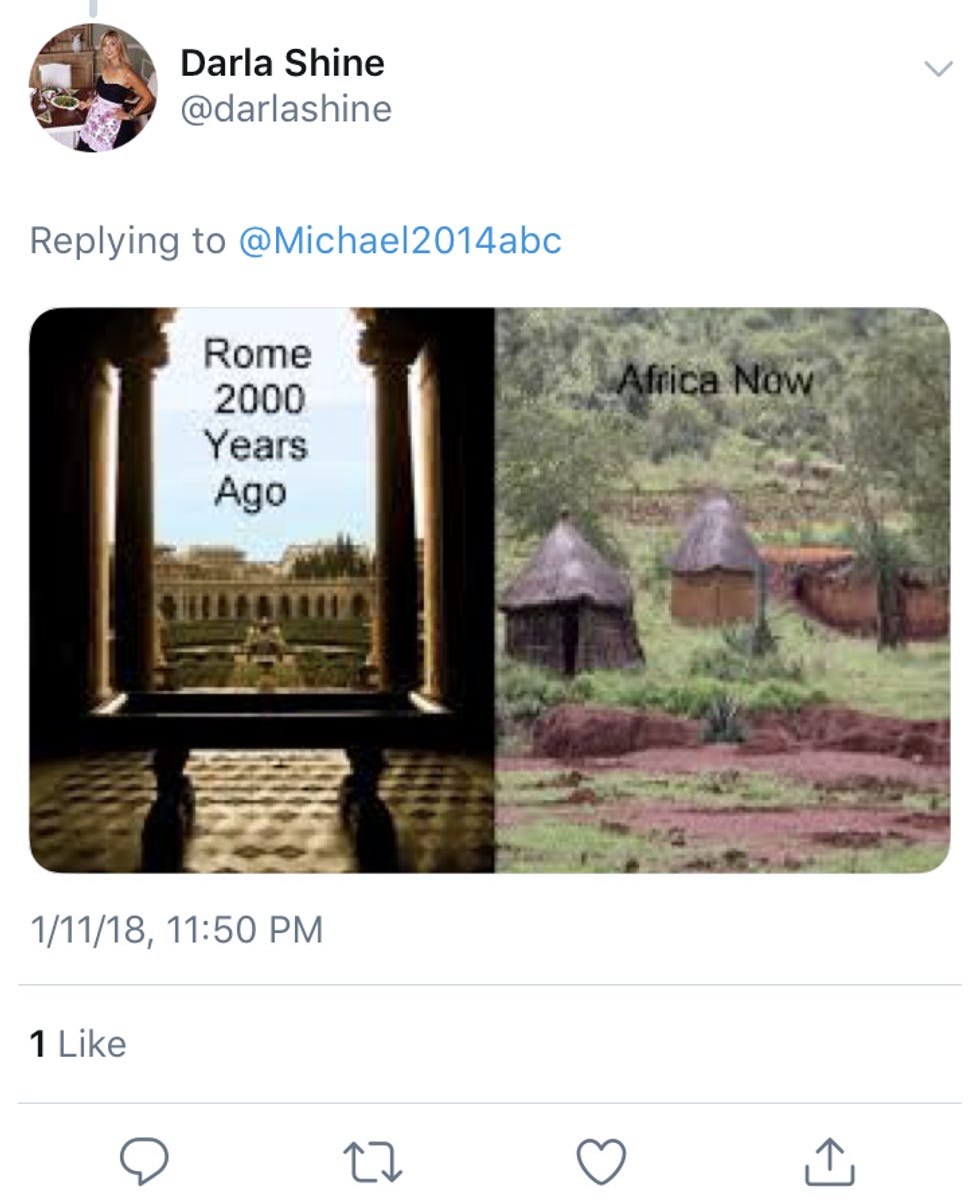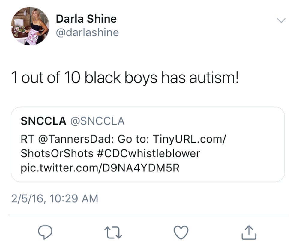 However, her 1950s fetish goes beyond the Sexxxy Donna Reed costumes and love of the patriarchy, as she is also a super wacky racist. Oh, and she's an anti-vaxxer, and sometimes combines the racism and the anti-vaxxer stuff in rather unusual and unexpected ways.